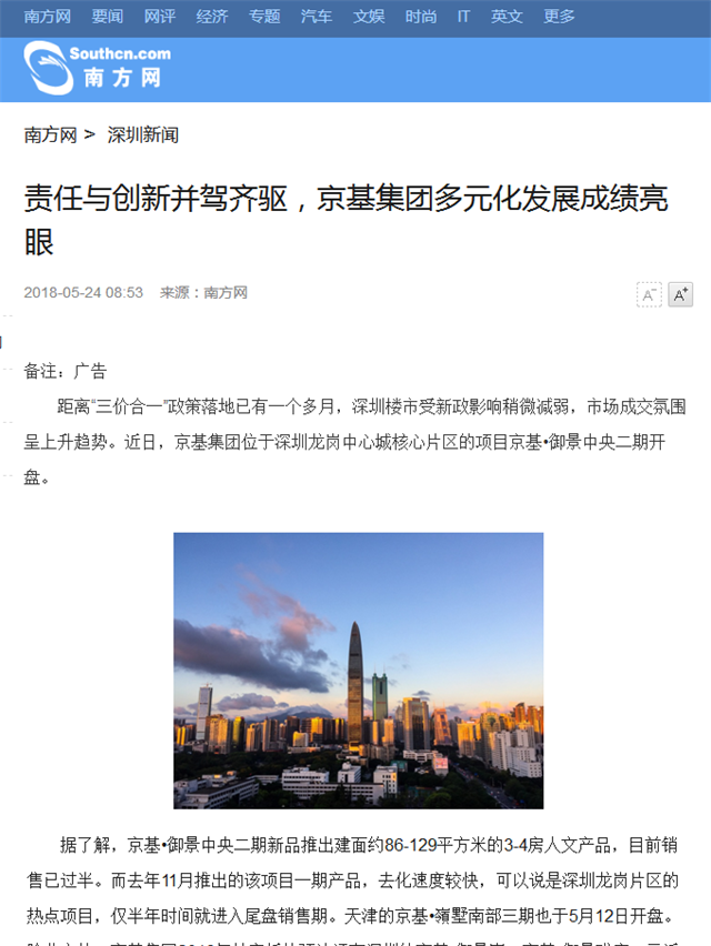 据了解,京基•御景中央二期新品推出建面约86-129平方米的3-4房人文产品,目前销售已过半。而去年11月推出的该项目一期产品,去化速度较快,可以说是深圳龙岗片区的热点项目,仅半年时间就进入尾盘销售期。天津的京基•嶺墅南部三期也于5月12日开盘。除此之外,京基集团2018年地产板块预计还有深圳的京基•御景峯、京基•御景珑庭、云浮的京基•英伦豪城二期等多个项目入市,可售货值预计超300亿元,销售业绩应可突破100亿元。