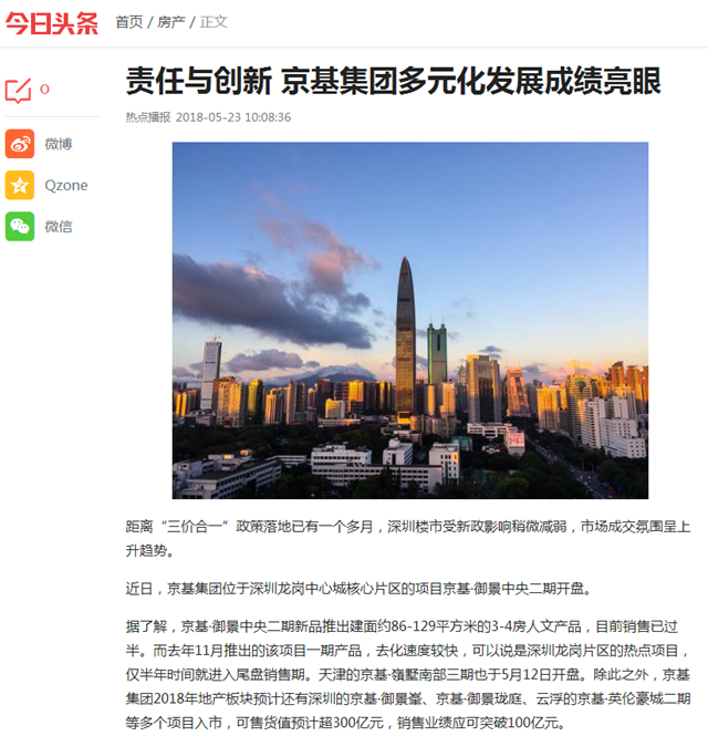 据了解,京基·御景中央二期新品推出建面约86-129平方米的3-4房人文产品,目前销售已过半。而去年11月推出的该项目一期产品,去化速度较快,可以说是深圳龙岗片区的热点项目,仅半年时间就进入尾盘销售期。天津的京基·嶺墅南部三期也于5月12日开盘。除此之外,京基集团2018年地产板块预计还有深圳的京基·御景峯、京基·御景珑庭、云浮的京基·英伦豪城二期等多个项目入市,可售货值预计超300亿元,销售业绩应可突破100亿元。