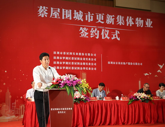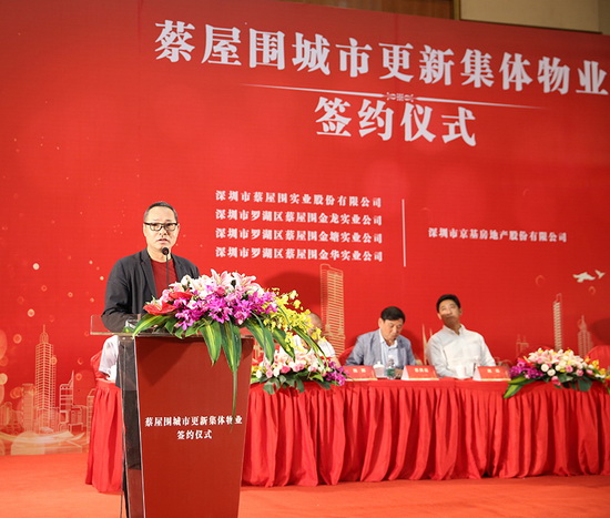 签约仪式上,蔡屋围股份公司董事长蔡洪亮致辞感谢京基地产对蔡屋围新一轮的发展所付出的贡献和努力。他强调,为配合罗湖区委、区政府对蔡屋围的新定位,蔡屋围股份公司董事会审时度势,借鉴老围改造的成功模式,根据“政府主导、市场运作、多方共赢”的工作原则,提出了“总体规划,分步实施,成熟一块开发一块”工作思路,对蔡屋围新七、八、九、十坊,南村、南村西、红宝路南村和清庆新村实施城市更新。希望每一位蔡屋围人紧紧围绕在董事会周围,攻坚克难,全力推进项目早日动工、早日回迁、早出效益。