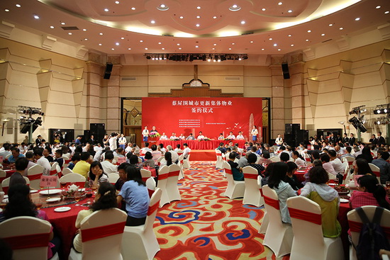 (上图为蔡屋围城市更新集体物业正式启动拆迁签约现场)