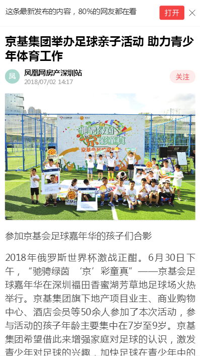 正如一位参加本次活动的家长接受媒体采访时说到:现在的孩子都是独生子女,足球又是一项需要很强的团队合作意识的运动,通过参加这样的活动,除了让孩子在活动中得到乐趣且有所学习,激发孩子的运动热情,同时可以培养孩子团队合作的能力。京基集团在这方面做了很多引导性的工作,一直坚持举办各种运动类活动,创造机会和平台让孩子和家长去接触去尝试,从原先被动地参加活动到现在主动积极去报相关体育运动的培训班,这是很大的转变。