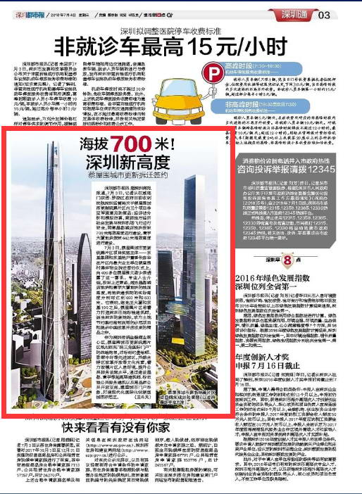 7月3日,蔡屋围城市更新统筹片区项目实施主体——京基集团和京基地产董事长陈华在片区内最大业主单位蔡屋围村集体物业拆迁签约仪式上,向400多位蔡屋围父老乡亲透露了这一喜讯。专业人士介绍,按照上述复函,减去晶都酒店地块和寰宇大厦地块的地面高度,两地块建筑物的实际高度分别可达到693米和633米。它表明,继地王大厦和京基100之后,蔡屋围片区将着力打造深圳市地标性建筑群,诞生深圳的新地标,成为土地节约集约高效利用的示范项目和展示中国改革开放成果的精品之作。