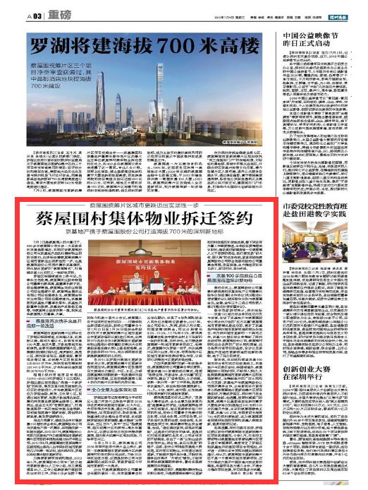 7月3日是蔡屋围人的大喜日子,400多位蔡屋围父老乡亲一大早就来到京基晶都酒店,共同见证蔡屋围股份公司与京基地产启动村集体物业的拆迁签约。此举标志着蔡屋围统筹片区城市更新迈出实质性的一步,也是蔡屋围股份公司再次携手京基集团,深化城市更新的“蔡屋围模式”,打造继京基100后的又一地标性项目。