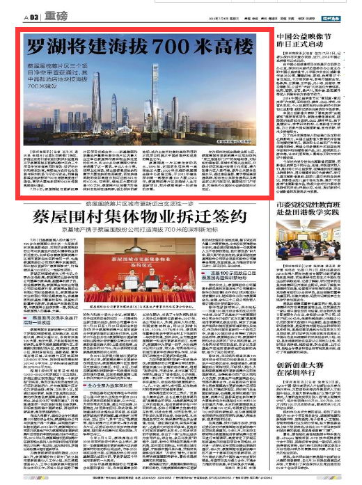 7月3日,蔡屋围城市更新统筹片区项目实施主体——京基集团和京基地产董事长陈华在片区内最大业主单位蔡屋围村集体物业拆迁签约仪式上,向400多位蔡屋围父老乡亲透露了这一喜讯。专业人士介绍,按照上述复函,减去晶都酒店地块和寰宇大厦地块的地面高度,两地块建筑物的实际高度分别可达到693米和633米。它表明,继地王大厦和京基100之后,蔡屋围片区将着力打造深圳市地标性建筑群,诞生深圳的新地标,成为土地节约集约高效利用的示范项目和展示中国改革开放成果的精品之作。