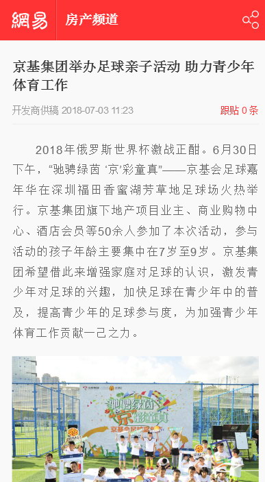 正如一位参加本次活动的家长接受媒体采访时说到:现在的孩子都是独生子女,足球又是一项需要很强的团队合作意识的运动,通过参加这样的活动,除了让孩子在活动中得到乐趣且有所学习,激发孩子的运动热情,同时可以培养孩子团队合作的能力。京基集团在这方面做了很多引导性的工作,一直坚持举办各种运动类活动,创造机会和平台让孩子和家长去接触去尝试,从原先被动地参加活动到现在主动积极去报相关体育运动的培训班,这是很大的转变。