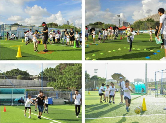 活动现场设置了游戏环节和足球课堂知识问答,其中游戏环节共有四个小游戏:“龙潭虎穴”(闯关)、“七上八下”(颠球)、“齐心协力”(接力)、“百步穿杨”(射门),让现场的孩子和家长在玩中感受足球的魅力与乐趣。此外,孩子们还在外籍教练的带领下,学习运球、传球、停球、射门等多项规范动作,深度学习足球这项全球性的运动,激发其对足球的喜爱。