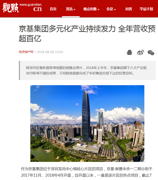 截至目前,2018年京基集团的地产板块销售业绩近50亿元,上半年在项目开盘、启动和拓展等方面动作频频。深圳的京基·御景中央二期、天津的京基·嶺墅南部三期等项目先后开盘,在深圳的多个城市更新项目启动拆迁签约,值得一提的是,位于罗湖区的蔡屋围城市更新统筹片区项目,其集体物业拆迁签约的启动引起了全国性的关注。