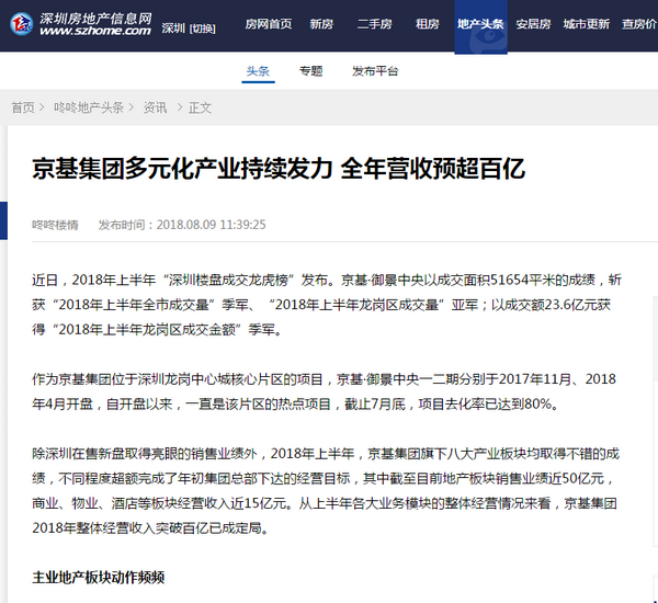 截至目前,2018年京基集团的地产板块销售业绩近50亿元,上半年在项目开盘、启动和拓展等方面动作频频。深圳的京基·御景中央二期、天津的京基·嶺墅南部三期等项目先后开盘,在深圳的多个城市更新项目启动拆迁签约,值得一提的是,位于罗湖区的蔡屋围城市更新统筹片区项目,其集体物业拆迁签约的启动引起了全国性的关注。