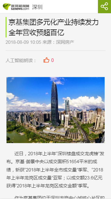 主业地产板块动作频频截至目前,2018年京基集团的地产板块销售业绩近50亿元,上半年在项目开盘、启动和拓展等方面动作频频。深圳的京基·御景中央二期、天津的京基·嶺墅南部三期等项目先后开盘,在深圳的多个城市更新项目启动拆迁签约,值得一提的是,位于罗湖区的蔡屋围城市更新统筹片区项目,其集体物业拆迁签约的启动引起了全国性的关注。