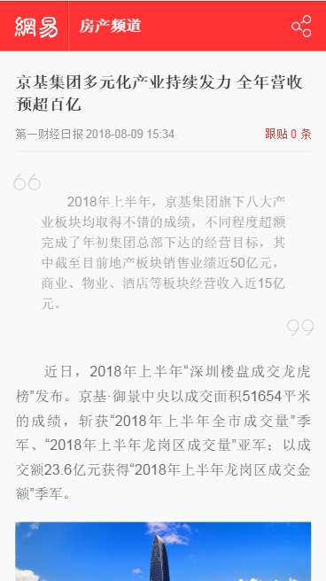 截至目前,2018年京基集团的地产板块销售业绩近50亿元,上半年在项目开盘、启动和拓展等方面动作频频。深圳的京基·御景中央二期、天津的京基·嶺墅南部三期等项目先后开盘,在深圳的多个城市更新项目启动拆迁签约,值得一提的是,位于罗湖区的蔡屋围城市更新统筹片区项目,其集体物业拆迁签约的启动引起了全国性的关注。