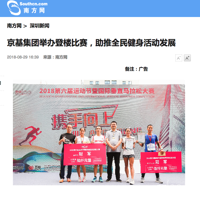 2018年8月26日,正值深圳38周岁生日,由京基集团、京基物业主办的2018京基100第六届运动节暨国际垂直马拉松大赛在京基100大厦南广场正式拉开帷幕。作为本届运动节的首个比赛项目,2018京基100国际垂直马拉松大赛以“携手向上•WE ARE YUONG”为主题,火热开跑,吸引了来自全国各地的选手以及意大利、美国、墨西哥、塞尔维亚等国际友人近500人齐聚深圳地标——441.8米、100层楼高的京基100大厦一决高下,竞争氛围相当激烈,极大激发了广大民众的运动热情,营造了全民健身的良好氛围,传递了不断追求美好生活、积极向上的正能量。