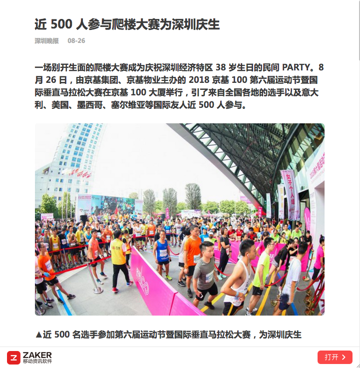 一场别开生面的爬楼大赛成为庆祝深圳经济特区 38 岁生日的民间 PARTY。8 月 26 日,由京基集团、京基物业主办的 2018 京基 100 第六届运动节暨国际垂直马拉松大赛在京基 100 大厦举行,引了来自全国各地的选手以及意大利、美国、墨西哥、塞尔维亚等国际友人近 500 人参与。