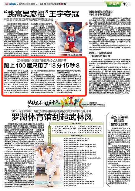 深圳都市报讯 8月26日,正值深圳38周岁生日,由京基集团、京基物业主办的2018京基100第六届运动节暨国际垂直马拉松大赛在京基100大厦南广场正式拉开帷幕。作为本届运动节的首个比赛项目,2018京基100国际垂直马拉松大赛以“携手向上·WE ARE YUONG”为主题,火热开跑,吸引了来自全国各地的选手以及意大利、美国、墨西哥、塞尔维亚等国际友人近500人齐聚深圳地标——441.8米、100层楼高的京基100大厦一决高下。