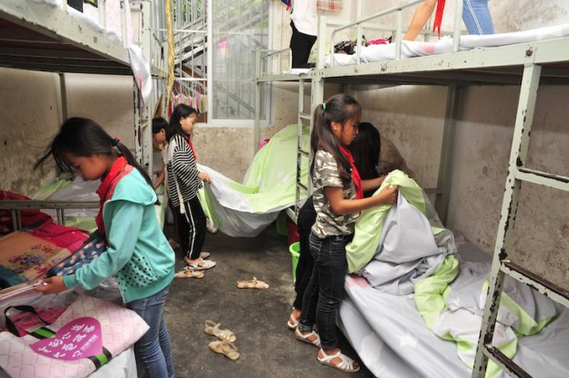 ▲ 孩子们用刚刚收到的床上用品给床铺 " 换装 "。