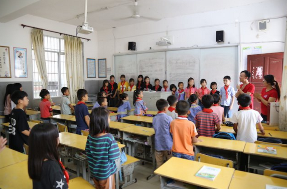 ▲ 14 日上午,在爱心助学捐赠仪式举行之前," 京基小课堂 " 在一个四年级班级开讲。图为学生们在京基集团代表人员的带领下,玩一个音乐游戏。