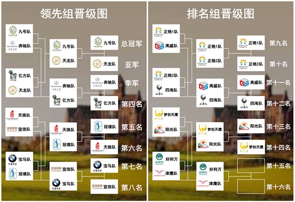 就在8月30号刚刚结束的半决赛中,脱颖而出的天津九号队与天龙队分别战胜对手,进入到总决赛的冠亚军之争,而亿方队与奔驰队也在激烈的竞争中,进入多了三四名的争夺。按照赛事规则,总决赛前四名的争夺需要经过18洞个人比洞赛和18洞四人四球最佳成绩比洞赛两场比赛的较量,并以两场比赛的成绩决定胜负。这就意味着一二和三四名的争夺要分别通过两轮比赛的较量,以每队每轮的得分累计相加数多的球队为胜者(获胜队大比分得1分,战平各得0.5分,输队得0分)。而其他球队需通过一轮比赛决定最终球队的排位
