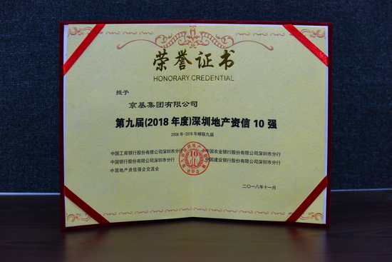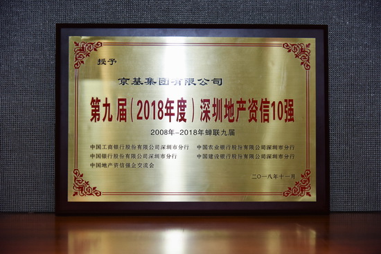 历经24年的稳健发展,京基集团始终坚持企业的诚信建设,诚信待人,严于律已,凭借着良好的产品品质以及品牌号召力,积极投身风起云涌的改革开放建设,持续为客户提供高品质、专业化的产品和服务,多年来一直保持着行业领先的品牌优势。能够连续9届蝉联“深圳地产资信10强”的荣誉称号,正是四大行以及社会各界对京基集团多年来良好的资产实力和品牌信誉的最有力肯定,也是对京基集团今后继续秉承诚信、责任的理念经营的有效促进。