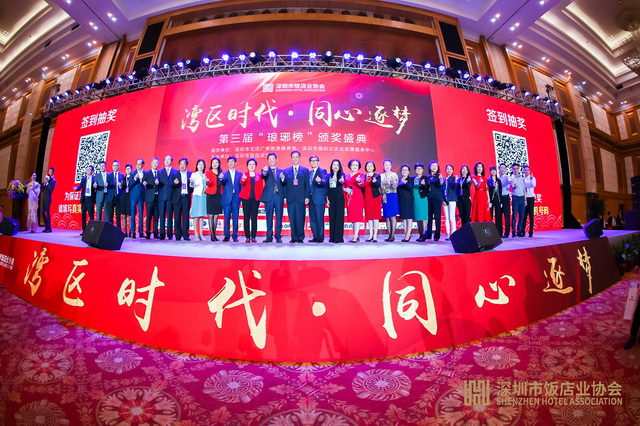 5月10日,由深圳市文化广电旅游体育局、深圳市福田区企业发展服务中心指导,深圳市饭店业协会主办的“湾区时代?同心逐梦”2019深圳市饭店业麒麟论坛暨第三届“琅琊榜”颁奖盛典在深圳五洲宾馆隆重举行。深圳市委统战部常务副部长范坤、中国饭店协会会长韩明、深圳市文化广电旅游体育局行业管理处处长张道新、福田区企业发展服务中心主任冯向阳、深圳市社会组织总会执行会长葛明等领导出席并致辞。