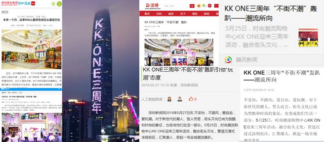 在原创IP引领玩潮热浪的同时,KK ONE运用新媒体营销方式,记录玩潮路线,推出玩潮攻略,整合微信、微博、抖音等新媒体流量入口,百万流量KOL、人气抖音网红齐聚KK ONE,沉浸式街区火爆网络,成功掀起街区打卡热潮。街区X艺术X大咖,KK ONE用原创IP将跨界元素完美融合,传递“潮流无界”。的理念,打造极致化潮流体验。此外,本次活动得到了深圳电视台、深圳特区报、深圳商报、深圳晚报、深圳新闻网、大粤网、新浪网、赢商网、中购联的大力支持,并对本次活动展开报道。