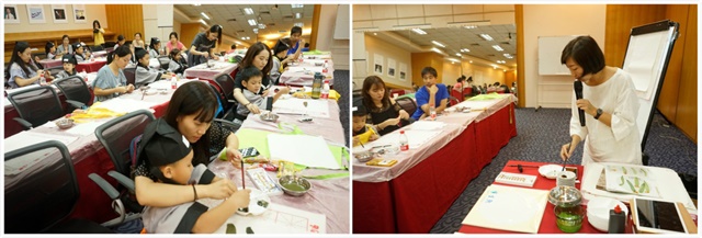14时30分,国画课堂正式开始。课堂上,国画老师耐心地引导现场小朋友一步步实践国画的正确操作,同时,家长们也纷纷在旁同步进行指导。小朋友们认真地跟着老师的讲解调和颜料,手握画笔在雪白的画纸上描绘着自己眼中的丝瓜、荔枝、葡萄……