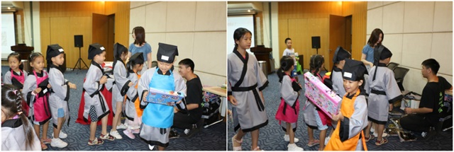 13时30分,开始签到。报名参加活动的家长携儿童陆续进入活动现场,签到领取了活动特定的儿童汉服,现场不少“古装变身”的小朋友们兴奋地跳着叫着,不时传出一阵阵欢笑声。