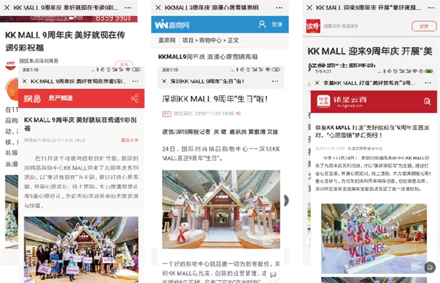 为感恩会员同享美好时刻,KK MALL联动超百家商户参与周年庆心愿礼遇,整合广发、招行、中行等各银行优质资源,为顾客打造年末购物狂欢。自11月15日起,依次推出5折美食券、388抵500嗨购券、9元秒杀网红奶茶等多重心愿好礼,满足了消费者对味蕾及购物的需求。以Vivienne Westwood、Calvin Klein等为代表的国际大牌均最低5折起,会员更可享满万返千、5倍积分、免费停车等专属权益。11月22日至11月24日,重磅礼遇吸引逾万人参与。在得到会员朋友的认可之余,销售的良好表现也增加了品牌方对KK MALL的信任感。 同时,此活动还得到了深圳特区报、赢商网、粤商业资讯、网易房产深圳、搜狐焦点、深圳商报、铱星云商等多家媒体的大力支持,并为KK MALL九周年庆展开报道。
