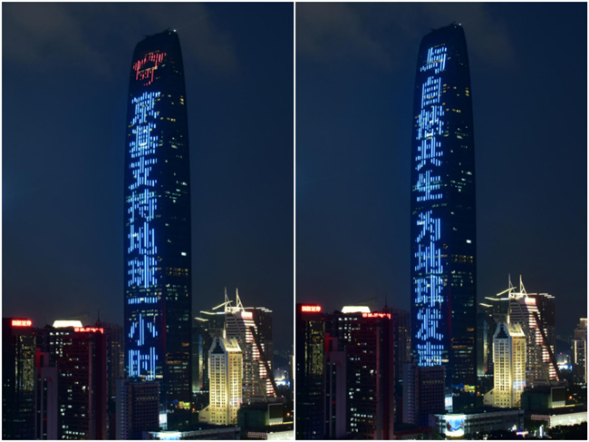 28日晚,深圳地标建筑京基100在熄灯前亮起“与自然共生,为地球发声,京基支持地球一小时”的字幕