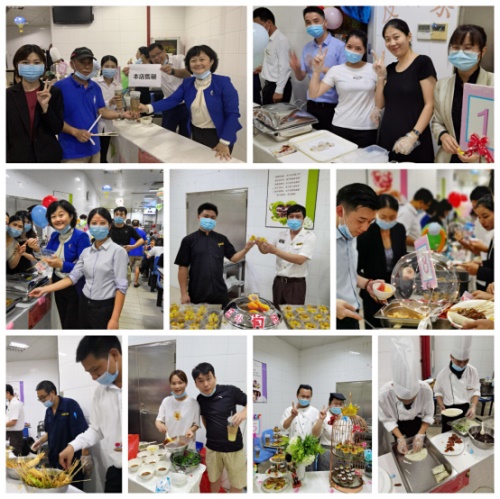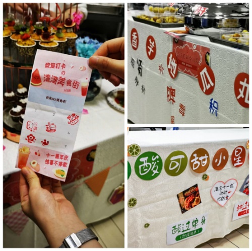 摆摊我们是认真的。此次湾湾美食街共9个摊位,种类多样、风味各异。分别是1号前厅部(抄手),2号财务部(“及食乐”炸粮),3号工程部(钵钵鸡),4号保安部(香芋地瓜丸),5号西餐部(精美小蛋糕),6号客房部(刘氏私房菜),7号行政办(甜蜜蜜糖水),8号市场销售部(柠檬凤爪、水果捞),9号中餐部(海湾片皮鸭)。9个摊位之间互相竞争,唯恐生意落后,纷纷开启了当街吆喝、争先拉客的模式,食客们纷纷成了抢手货,好一幅热闹的场面。