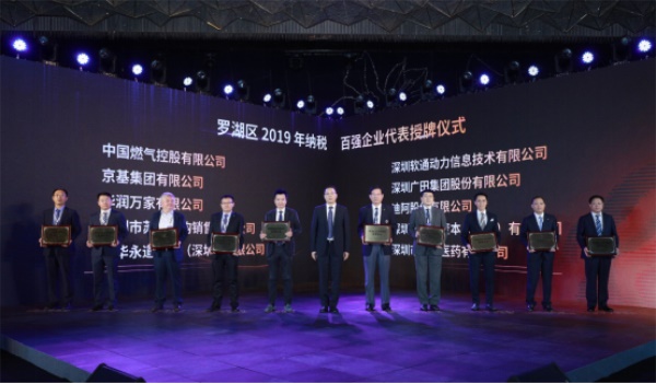 在大会的纳税百强企业授牌仪式环节上,罗湖区政府为20家辖区内2019年纳税百强企业代表授牌,表彰这些企业过往为罗湖区的经济发展做出的贡献,其中,京基集团与平安银行、宝能控股、普华永道等企业共同在现场接受表彰。