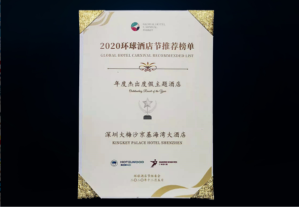 2020年11月,以深圳酒店营销额第一的傲人成绩和品牌影响力,夺得“飞猪旅行2020年度最佳酒店”大奖的海湾酒店,于12月5日,在酒店筋斗云与广州设计周举办的【2020 环球酒店节高峰论坛】上,再次凭借得天独厚的地理位置、旖旎的山海景致及高水准的个性化服务,斩获“年度杰出度假主题酒店”大奖,在2020年的荣誉历程上再添辉煌的一笔。