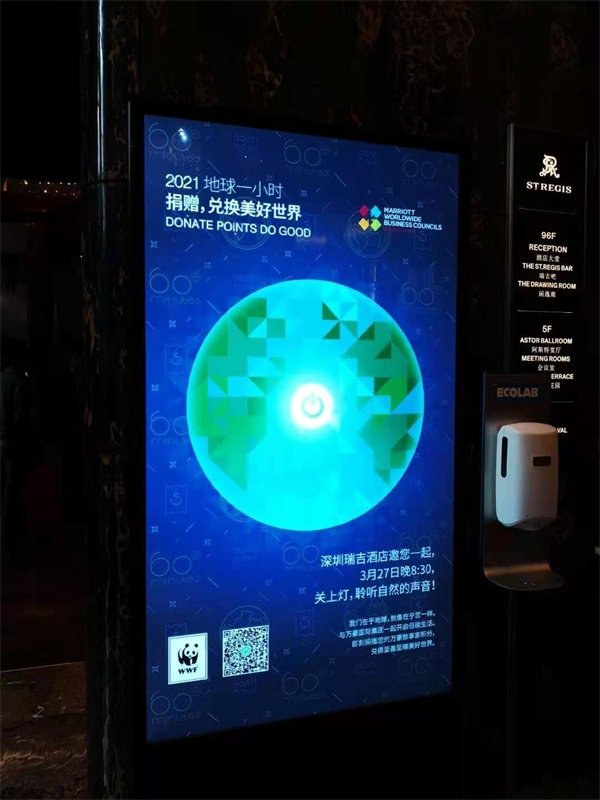 京基深圳瑞吉酒店在27日这一天,邀请酒店客人扫描二维码捐赠万豪旅享家积分,这些积分将直接捐赠给WWF组织,用于支持该组织后续举办的环保公益慈善活动;京基海湾酒店、大梅沙京基洲际酒店在当天晚上,关闭了所有外围墙体泛光照明,并调暗或关闭室内公共区域照明,同时也向每一位住店客人发出邀请,呼吁和鼓励大家在日常生活中养成节能环保的好习惯——关闭不必要的照明灯具及电器,注意节水节电、减少汽车尾气排放,多使用绿色公共交通,力行垃圾分类等…此外,海湾、洲际两家酒店地处滨海,2020年曾多次组织员工进行清理海滩垃圾行动,身体力行保护自然界生物的多样性,守卫地球之蓝。