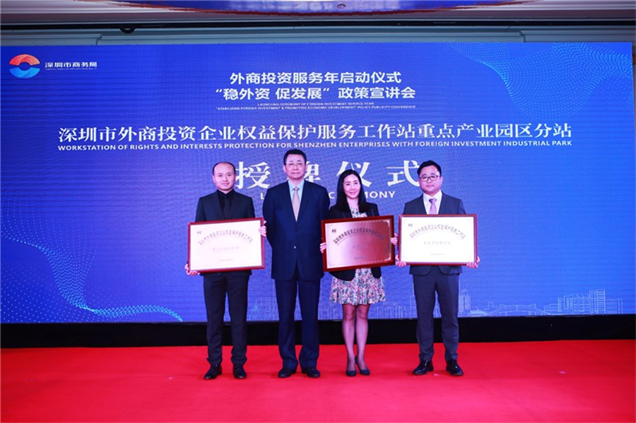 宣讲会上,深圳市人民政府吴优副秘书长出席,并为京基100等3个重点产业园区颁授“深圳市重点产业园区外商投资企业权益保护服务工作站(分站)”牌匾。