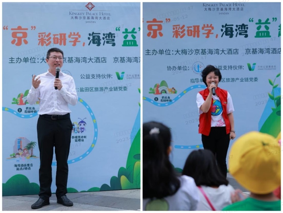 梅沙街道党工委委员、党建办主任于凯先生为本次活动开场致词,于主任向大家讲述了盐田区在公益环保方面的系列成就,表示盐田区作为全国首批“国家生态文明建设示范区”,正在以盐田梅沙作为试点,积极探索近零碳排放,建设人与自然和谐共生的零碳样本,致力为低碳环保迈出创新而坚实的一步。京基海湾酒店党支部书记、总经理王莉丽女士对本次活动致词,表示今年是第54个世界地球日,也是海湾酒店发起地球日公益活动的第3年,过去的每场公益活动都受到了大家的热情参与和大力支持。今年的地球日,党建引领企业在延续蔚蓝地球系列活动的同时创新了活动形式,活动反响比以往更加热烈,并表示看到越来越多的新朋友加入到公益行动中来感到开心和骄傲,也非常期待与大家一起践行环保,向蔚蓝地球贡献力量!